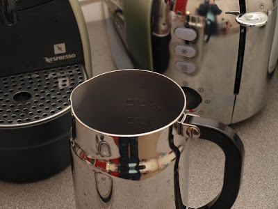 之前用的那台Bodum frother手要一直按在開關上,很痠,依我們每天早上一杯咖啡的習慣,我們也想要Nespresso那台Aeroccino來降低手抽筋的風險。這Aeroccino原本價格是£46,幸好沒有太早訂,12/1以後英國為刺激消費,降營業稅,這台變成£45.02,雖說不多,但如果買到原價還是會切心的。再一次,謝謝自己忍住了。