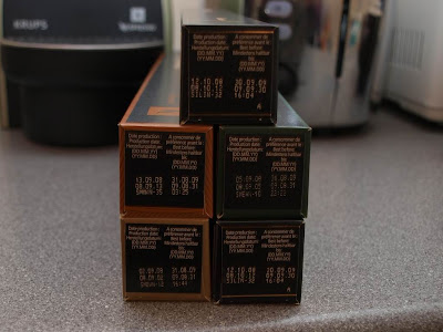 2008 Variation系列一共有三種口味,Crystallised Ginger, Caramel和Mandarin。這三種都是以Livanto為基底再各自加上ginger, vanilla caramel和mandarin果香調和而成。因為怕不好喝,焦糖口味是比較能不擔心的味道,所以除了Caramel口味訂了20個外,另外兩種各訂10個。扣掉低咖啡因系列(Tony覺得低咖啡因咖啡不天然),其他9種加上去我們剛剛好訂了200個膠囊(多數都20個,少數一兩種訂10個)。詢問過Nespresso客服,膠囊可保存約一年左右,這次收到這批有8月底也有9月底到期的。但我想我們應該不會有快過期還沒喝完的困擾。
