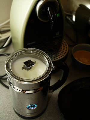 第二次再使用時先把牛奶溫熱後就表現很正常了。只是...不知道是否我們還不熟悉它,用了兩天我們覺得它的奶泡不若原來Bodum那台打的細緻,可是它價格是人家的4倍(Bodum暑假打折時買,原價£15,特價£10.5),不可能只有勝在防手痠吧?嗯,要再來多用幾次研究看看.....。