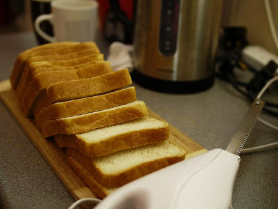 昨天用KA打了兩條12兩蜂蜜吐司麵糰,烤好放涼馬上用新買的Haden電動刀切切看。