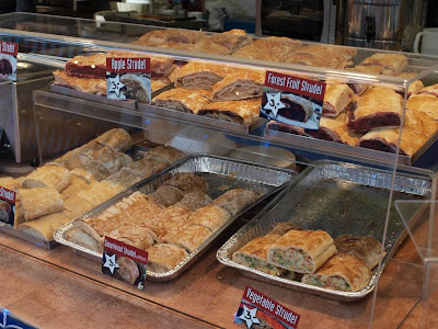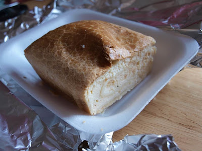 上圖是一種德國點心Strudel,質地像派皮的外皮包裹甜的(ex:櫻桃、蘋果、野苺...etc)或鹹的(蔬菜、馬鈴薯...etc.)餡料,老闆娘會切成小塊給人試吃,味道不錯,不過適合配茶/咖啡,以免過膩。我沒買Strudel卻買了一塊原味起司蛋糕,兩者價錢一樣都是£3。原以為是口味厚重的起司蛋糕,嚐了卻大失所望,不知是cheese原本就這味道,還是為省成本放的少了,又或是糖加的不夠,吃來味道不足,沒什麼味道,難怪當時老闆娘推薦我買藍莓口味,想來大概是自己心虛,想用甜甜的藍莓彌補起司的不足,虛晃一招。原味起司蛋糕長這樣↓↓