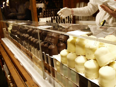 城市的大小影響聖誕市集的規模。週一到Leeds參加畢業典禮,就發現Leeds的聖誕市集規模大得多,賣的東西也不盡相同。買了另一種德國甜點,外形像鐘,造型精巧,也很脆弱,一沒拿好就會碰碎。老闆說這可是遠從德國空運過來,現訂現做,所以從他下單到寄到英國約需1~2星期,室溫保存可放1~2週。甜點內部是marsh mallow,外面飾以各種口味的巧克力,小的一個£0.7,大的一個£1.5,口味多樣,但不巧的是老闆說他目前只有現場的4種口味,隔天去的話他有22種口味。沒關係....,若真有22種,我們大概也是眼花撩亂不知從何選起吧!於是現有的除了肉桂口味1個以外,其他3種各買了兩個,再加上一個大的薄荷巧克力口味。嚐起來口感酥酥軟軟很特別,不過是一種很空洞的fu,並不是紮實口感的甜點。雖然味道不錯,但這種東西是吃口味的,沒吃過嚐嚐看倒可以。我們買過這一次,下次應該不會再買了。