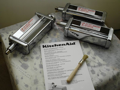 ),應該買什麼都覺得不會貴吧!一組內含一個壓麵的(Roller),可以用於製作Lasagne;兩個切麵機,一個可製作寬約6mm的乾扁麵條、另一個則可製作寬約1.5mm的細長條義大利麵;再加上一個小刷子和使用說明,小刷子我想是用來清理機器用的。